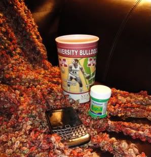 For TV viewing, I always have something to drink — usually water, but sometimes Dr. Pepper on ice — in my Virginia Tech tumbler. Also catalogues, magazines, one of my Mom’s handmade throws, and often-but-not-always, popcorn.