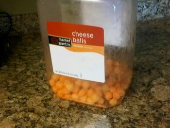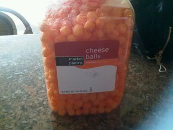 One time I bought a giant thing of cheese balls like that at Sam’s and my sister was too embarrassed to stand in line with me. Um, what’s wrong with cheese balls? Apparently you are not embarrassed either. Good.