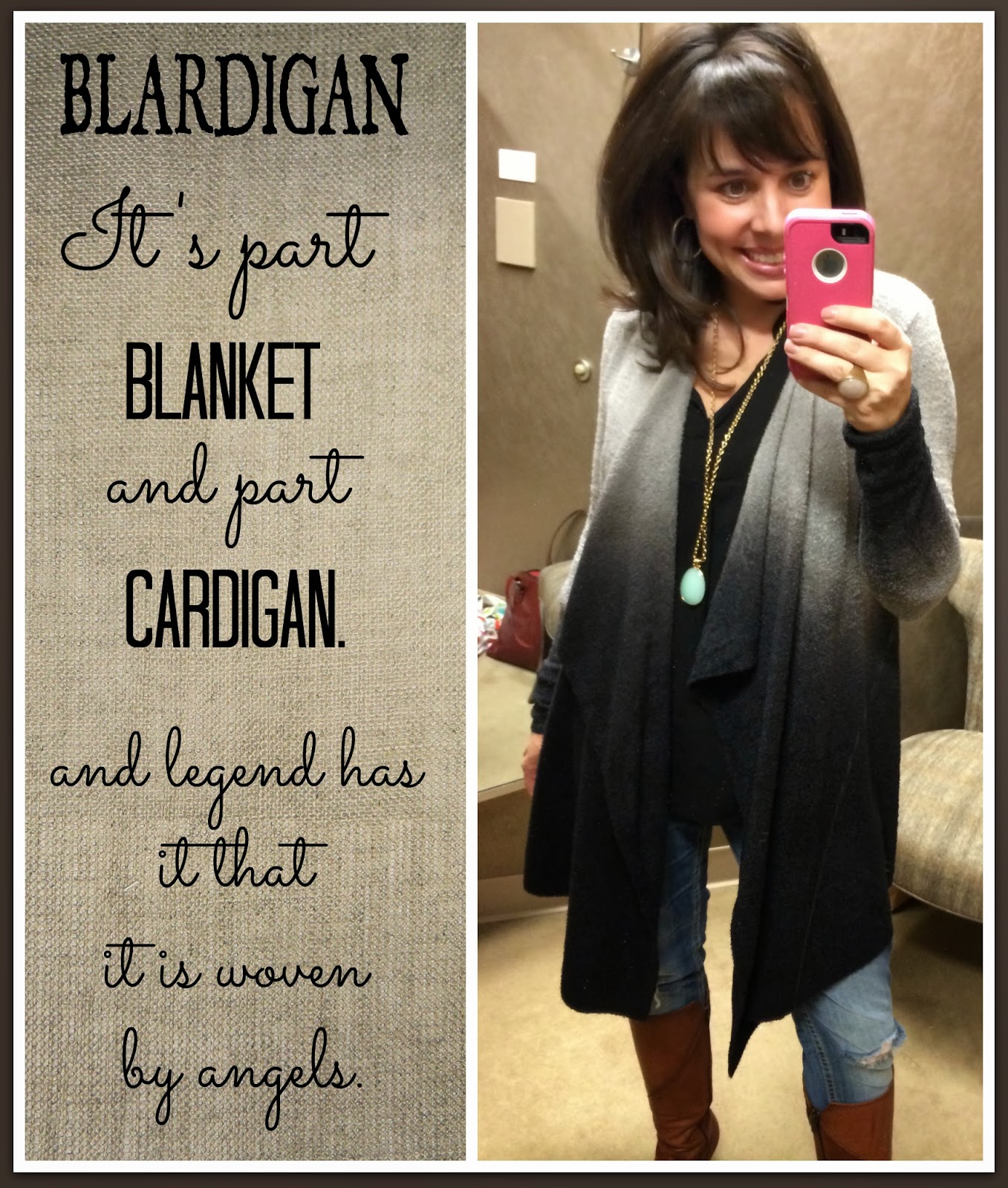 That cardigan has a following due to Sheaffer, who blogs over at Pinterest Told Me To! They call it a blardigan – blanket/cardigan.